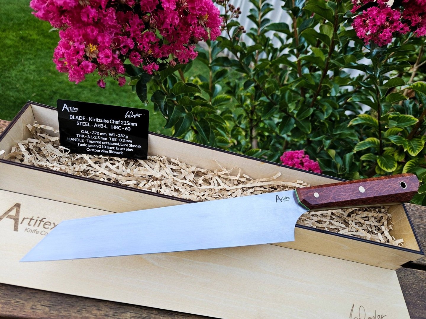 Kiritsuke style master chef's knife, long minimal curve edge, double bevelled with a low point. Larger handle for good purchase by the large hand. One off, hand made from start to finish.