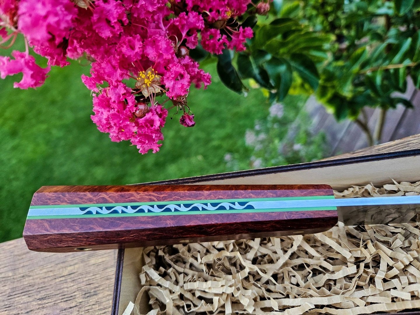 - Handle: Tapered octagonal, lace Sheoak timber, toxic green G10 liners, brass pins, custom vine file work.